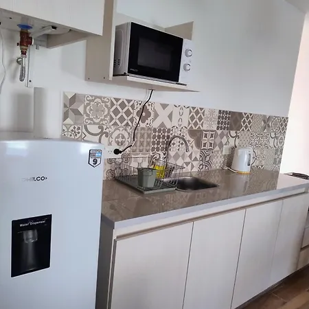 A Maimará városi ingatlanban van egy mikrohullámú sütővel, elektromos vízforralóval és hűtővel teljes konyha.